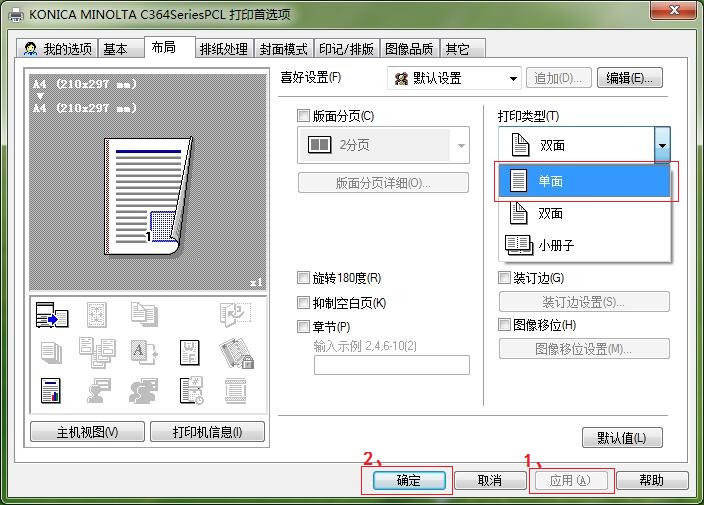第四步,再选择“布局” — 打印类型“单面” — “1、应用” — “2、确定”