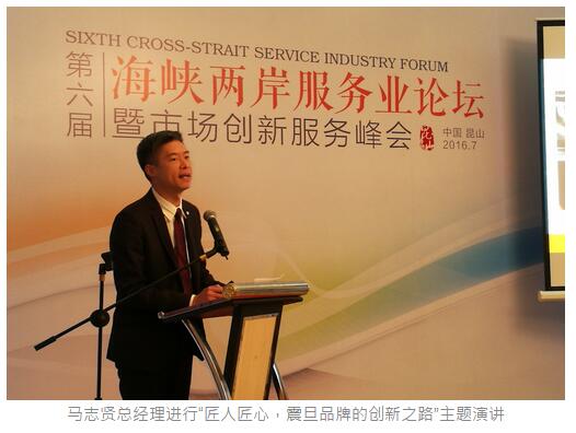 为进一步推动海峡两岸中小企业的合作,加强服务中小企业各类型机构的交流,由中国商业联合会、台湾服务业联盟协会共同主办,中国中小商业企业协会联合承办的第六届海峡两岸服务业论坛暨中小企业合作峰会,于7月6日至8日在江苏省昆山市皇冠国际会展酒店隆重举行。震旦集团荣获“海峡两岸卓越表现奖”,马志贤总经理代表震旦受邀出席领奖,同时在市场创新服务峰会上进行以品牌创新为主题的演讲,获得了在场嘉宾的阵阵掌声。